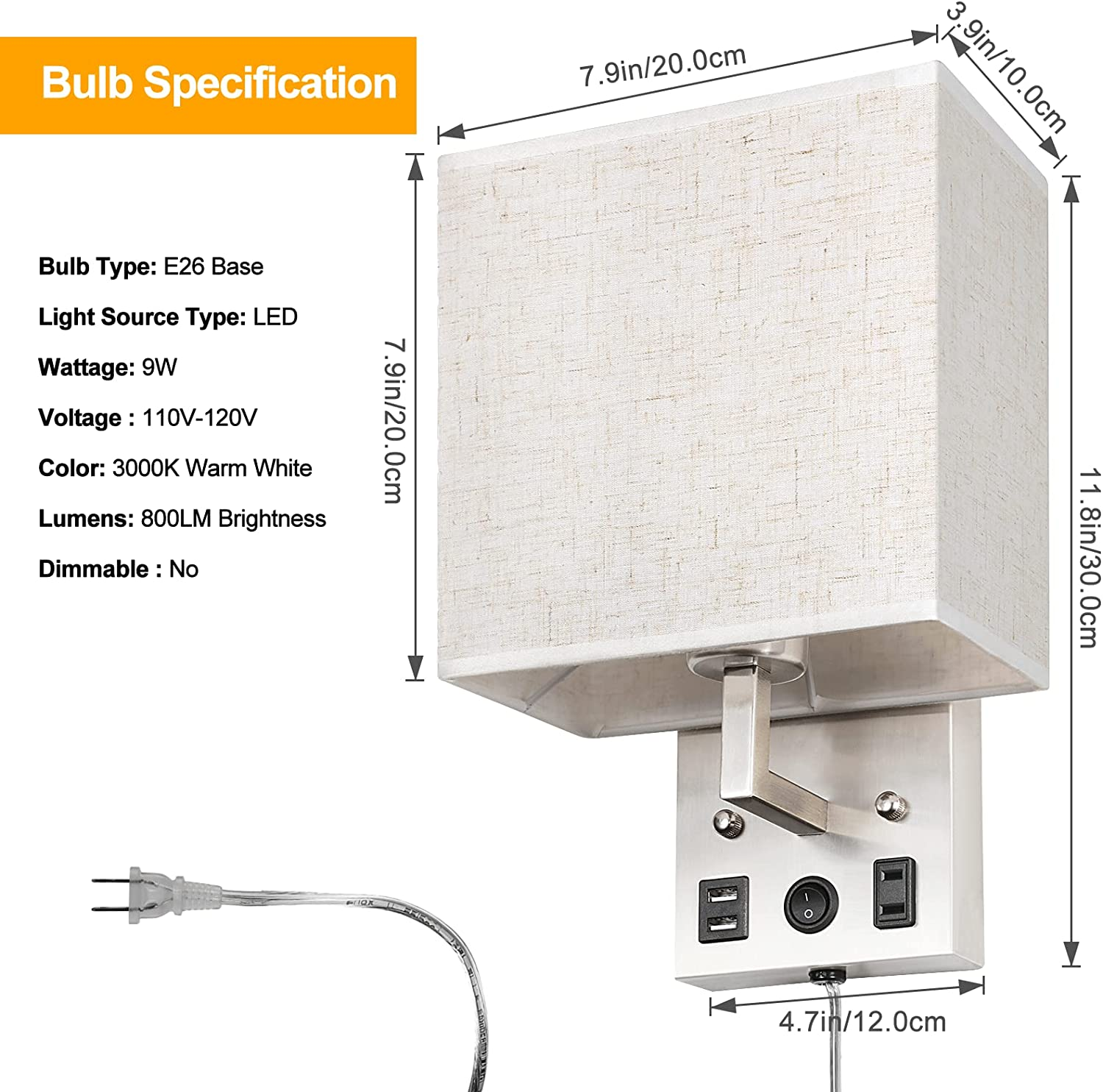 Bedside Wall Lamp Set of 2 Plug in Wall Light with Usb Charging Ports and Ac Out