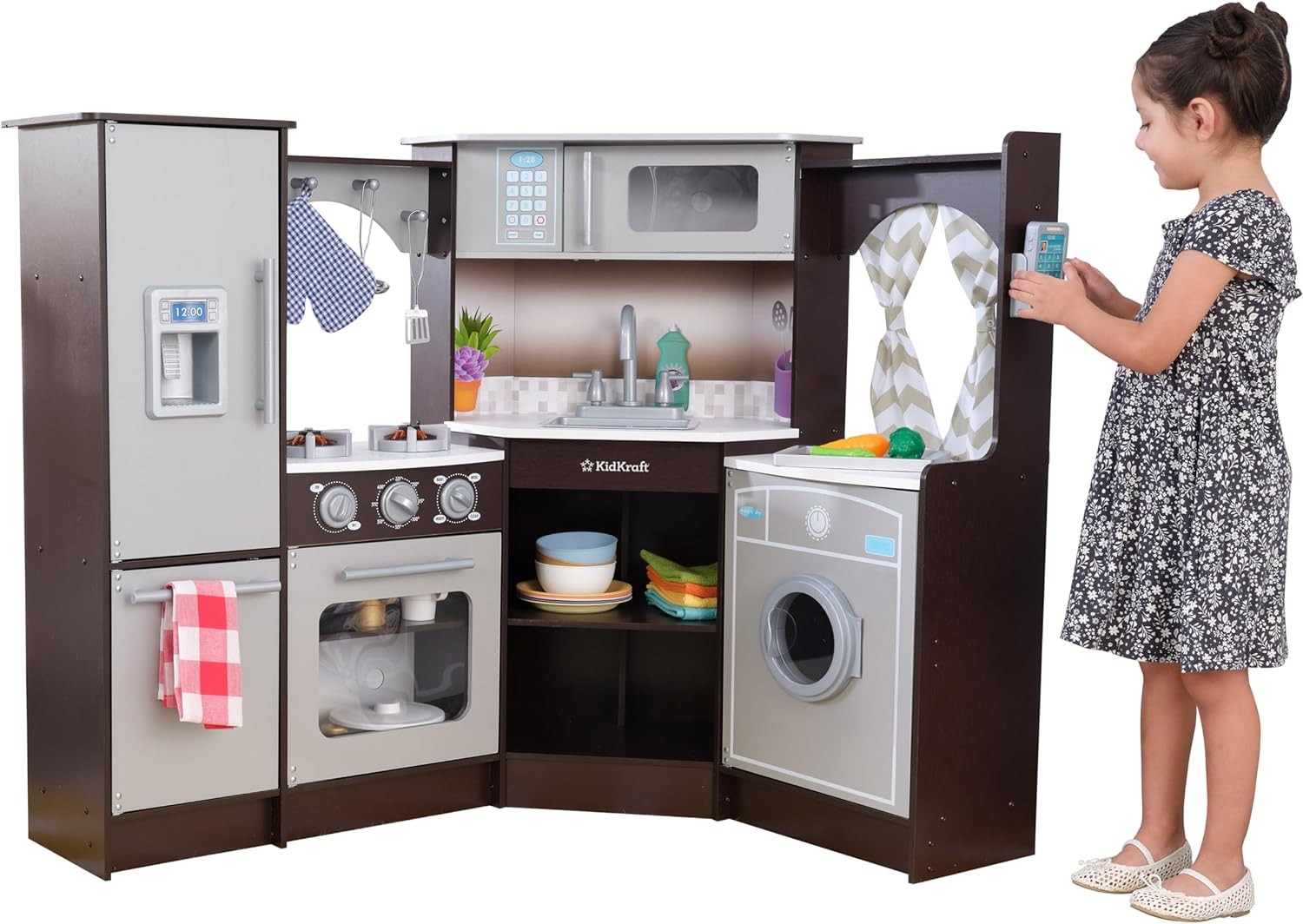 Our KidKraft Ultimate Corner Play Kitchen Set with Lights and Sounds is loaded with fun interactive features to engage your little chefs and keep them cooking. The stovetop burners and ice maker both feature lights and sounds, oven knobs turn and click and appliance doors really open and close. Functional shelving and cabinets with doors that open and close provide plenty of convenient storage for any KidKraft kitchen accessories. With so much to explore, kids will feel like they're cooking just like Mom and Dad!