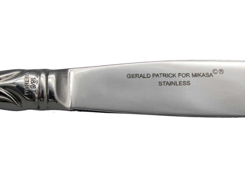 Flatware is marked "Gerald Patrick for Mikasa 18/8 Stainless Vietnam"