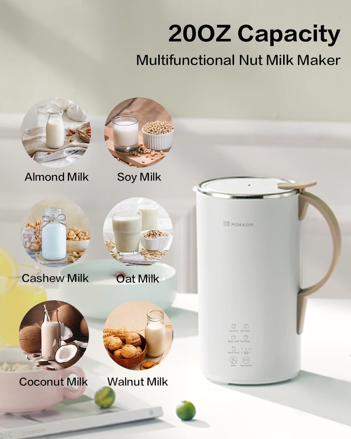 OK MOKKOM Automatic Nut Milk Maker 20 oz Soy Milk Maker, Homemade Almond, Oat, Coconut, Soy, or Plant-Based Milk Dairy Free Beverages, Almond Milk Maker with Delay Start/Boild Water/Self Clean - White